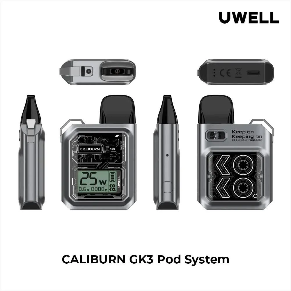 Uwell Caliburn GK3 Pod Kit یکی از جدیدترین مدلهای سری Caliburn است که برای کسانی که به دنبال تجربهای ساده، راحت و کارآمد از ویپینگ هستند طراحی شده است. این دستگاه با ظرفیت باتری 900 میلیآمپر ساعت و توان خروجی 25 وات، قدرت کافی برای تولید بخار و طعم عالی فراهم میکند. این دستگاه با پورت USB Type-C به سرعت شارژ میشود، بهطوری که همیشه آماده استفاده است.