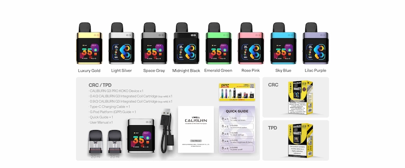 نمایشگر رنگی بزرگ دستگاه اطلاعات کاملی از جمله توان، درصد باتری، مقاومت کویل و تعداد پاف را نمایش میدهد و استفاده از دستگاه را ساده و حرفهای میکند. پادهای سری G3 با کویل مش داخلی، طعم خالصتر و بخار یکنواختتری نسبت به نسلهای قبلی ارائه میدهند و نیاز به تعویض کویل جداگانه را حذف کردهاند.